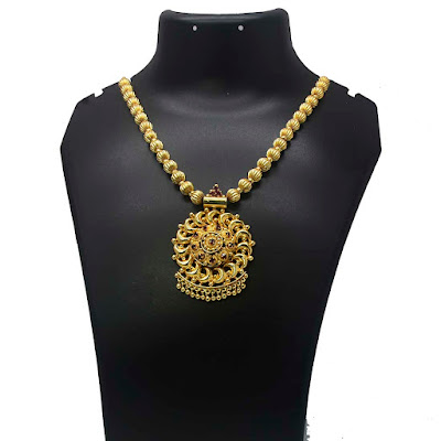 Gold Plated Mc Ball Designer Floral Ruby Stone Necklace|Kollam Supreme: Gold Plated Mc Ball Designer Floral Ruby Stone Necklace is classic but trendy jewellery for women. The big floral pendant is adorned with synthetic ruby stones. The designer ball chain has an adjustable link chain. This neckpiece will definitely be a treasured inclusion in every woman's jewellery collection.