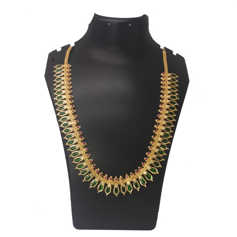 South Indian Traditional Green Nagapadam Long Necklace is very popular wedding jewellery. The eminent gold-plated Kerala Nagapadam long mala is adorned with semi-precious ruby stones. This imitation classic neck jewellery is suitable for women on occasions like Marriages , engagements and festive occasions .
